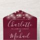 Le tout dans un faire-part de mariage avec de jolies lampes à cordes, des jarres de maçon, un nom élégant de script signature et des initiales monogrammes sur un arrière - plan bordeaux. L'invitation comprend une carte RSVP perforée qui peut être adressée individuellement ou laissée vide pour que vous puissiez écrire à la main les coordonnées de votre invité. Conçu par Thisisnotme©