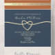 Donnez le ton à votre mariage de automne avec cette invitation tout-en-un boho moderne, avec un design minimaliste dans des tons bleu marine et terre cuite riches. Accentué d'un coeur de corde dorée romantique et d'espace pour une photo personnalisée du couple sur le dos, cette invitation rustique et élégante inclut vos détails mariages et section RSVP dans un agencement élégant. Un mélange parfait de simplicité et de chaleur pour votre célébration inoubliable. Remarque : Cette invitation nécessite une enveloppe distincte pour l'envoi.