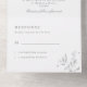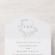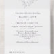 Une faire-part de mariage tout-en-un élégante et traditionnelle avec une crête de bouclier avec des feuilles gris clair avec votre monogramme au centre. Les motifs de feuilles sont éparpillés dans le design, avec une pratique déchirure de la section rsvp. Personnalisez avec vos détails en texte gris.