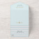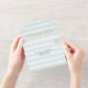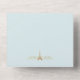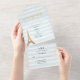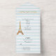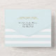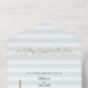 Mariage moderne rayé Paris thème tri-plié invitation faite en aqua clair et motif blanc rayé horizontal rayé, avec graphiques fleuris d'or et une galerie d'or à l'aspect tour Eiffel. Personnalisez le texte personnalisé pour votre journée spéciale.