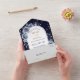 Cette élégante invitation de mariage avec la carte RSVP déchirante combine d'étonnantes images aquarelles de bouquets de rose bleu clair avec la typographie moderne. Votre texte d'or et de bleu se trouve dans un bloc d'arc de cathédrale blanc, et les images florales sont autour. Un peu de subtil confetti en or ajoute un peu de brillant à l'arrière - plan bleu foncé dramatique. Le rabat arrière contient votre propre photo spéciale. Le fond RSVP a beaucoup de place pour votre propre texte, et est facile à customiser. Nous sommes toujours heureux d'aider, alors n'hésitez pas à nous envoyer un message si vous avez besoin d'aide. Si vous avez une réception sous forme de buffet, nous pouvons travailler avec vous pour reconcevoir la partie RSVP, alors n'hésitez pas à demander !