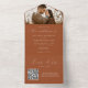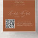 Faire-part de mariage tout-en-un élégant avec votre photo fiançailles en haut du design. Vos noms et détails mariages sont affichés en texte blanc avec accents de script de calligraphie moderne sur un arrière - plan en terre cuite. Le design comporte un code QR pour que les clients puissent RSVP en ligne et voir les détails du mariage sur votre site mariage. Conçu pour coordonner avec notre collection de mariages Modern Elegance.
