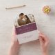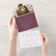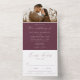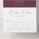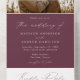 Faire-part de mariage tout-en-un élégant avec votre photo fiançailles en haut du design. Vos noms et détails mariages sont affichés en texte blanc avec des accents de script de calligraphie moderne sur un arrière - plan vin-violet. La conception comporte une carte RSVP détachable ci-dessous qui peut vous être envoyée par la poste en tant que carte postale. Conçu pour coordonner avec notre collection de mariages Modern Elegance.