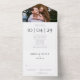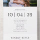 Un élégant minimaliste noir et blanc tout en un faire-part de mariage avec votre photo, date spéciale et détails mariages ensemble dans la typographie classique et chic. L'invitation comprend une carte RSVP perforée qui peut être adressée individuellement ou laissée en blanc pour que vous puissiez écrire à la main les coordonnées de votre invité. Conçu par Thisisnotme©