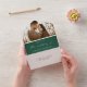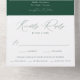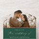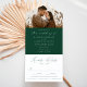 Faire-part de mariage tout-en-un élégant avec votre photo fiançailles en haut du design. Vos noms et les détails du mariage sont affichés en texte blanc avec des accents de script de calligraphie moderne sur un arrière - plan vert. La conception comporte une carte RSVP détachable ci-dessous qui peut vous être envoyée par la poste en tant que carte postale. Conçu pour coordonner avec notre collection de mariages Modern Elegance.