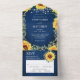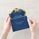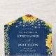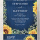 Ces invitations de mariage comprennent une bordure florale d'aquarelle de tournesols, des fleurs d'haleine de bébé et du feuillage sur un arrière - plan en bois bleu marine avec des lampes à cordes brillantes. Personnalisez-les avec votre propre texte. Veuillez visiter ma boutique pour trouver les produits mariages correspondants.