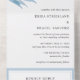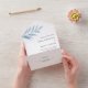 Elégant bleu poussiéreux All In One Faire-part de mariage avec un agencement simple avec une feuille de vert d'eucalyptus aquarelle peinte à la main dans le coin supérieur gauche avec vos détails mariages dans un agencement moderne. Le fond est une carte postale RSVP perforée. Ce joli thème botanique tout en un seul faire-part de mariage serait parfait pour un mariage de printemps ou d'été.