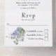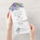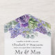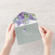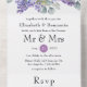 Faire-part de mariage tendance avec des feuilles d'eucalyptus et de succulents plantes mélangés avec des fleurs aux accents de lilas pastel, violet et violet.