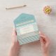 Lumineux, aéré et audacieux, ce faire-part de mariage rétro moderne tout en un présente des rayures pastel turquoise à l'aquarelle, un agencement épuré, un arrière - plan en ivoire et un élégant détail de cordes d'or. Conçu dans un sceau pratique et au format d'envoi, il comprend RSVP et des sections de détails dans une pièce facile à envoyer. Parfait pour les mariages de plage, de bord de mer ou d'été avec une ambiance ludique et contemporaine.