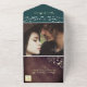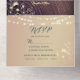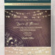 Elégant, moderne, champêtre, vert émeraude, or rose et bois rustique mariage invitation tout en un avec dentelle fleurie d'or, script de calligraphie simple, lumières à cordes et image personnalisée du couple à l'arrière. Ajoutez votre photo, les détails du mariage et rsvp.
