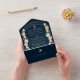Découvrez l'élégance intemporelle avec cette invitation d'inspiration Art Nouveau Céleste avec votre propre code QR ! Doté d'une arche dorée rayonnante, de fleurs blanches délicates et d'étoiles chatoyantes contre un arrière - plan bleu marine profond, ce design donne le ton d'une célébration sophistiquée. Parfait pour les mariages, les galas et les événements marquants ! Veuillez noter que l'or sur ce produit n'est PAS du papier d'aluminium réel ; il est imprimé à plat.