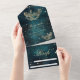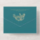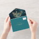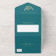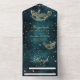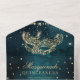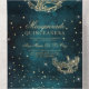 Un QUINCEAÑERA moderne, chic et glamour avec un masque de mascarade en or dessiné à la main avec parties scintillant or scintille sur un arrière - plan couleur émeraude turquoise foncé avec rsvp le tout dans une seule invitation.