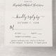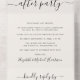 Elément crème moderne et élégant ou faire-part et réception mariage privée, le tout dans une seule invitation. Customisez votre faire-part salon/mariage, invitation à la réception et choix de menu. "Happily Ever After Party" est écrit dans une simple typographie et un script contemporain avec des swashes. Une carte postale RSVP vous offre une réponse écologique et sans enveloppe de la part de vos invités.