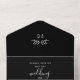 Cette faire-part de mariage tout en un monogrammé respire l'élégance et la simplicité avec son design minimaliste. En haut, les initiales du couple prennent le devant de la scène, joliment entremêlées, et ornées d'une délicate branche vectorielle, ajoutant une touche de nature à la composition globale. L'utilisation d'un arrière - plan noir et d'un texte blanc crée un contraste saisissant, mettant l'accent sur la formalité de l'occasion et ajoutant un sentiment de sophistication. La police de calligraphie utilisée dans l'invitation donne un air d'écriture gracieuse, imitant l'invitation avec une touche personnelle et intime. Associé à la police sans serif, il parvient à un équilibre harmonieux entre éléments classiques et modernes, ce qui le rend attrayant pour les goûts traditionnels et contemporains. L'inclusion d'une carte RSVP séparée en blanc avec du texte noir permet de répondre facilement à l'invitation. Ce choix assure une fonctionnalité tout en maintenant la cohérence esthétique globale de la suite. En résumé, ce tout-en-un monogrammé est un chef-d'oeuvre d'une beauté sobre, alliant un design monogramme complexe, un jeu de couleurs minimaliste noir et blanc, un mélange parfait de calligraphie et de polices sans serif, qui se réunissent pour donner le ton d'une célébration mariage raffinée et mémorable.