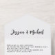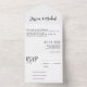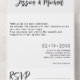 Présentant la Faire-part de mariage tout-en-un de la collection Elegance - une solution sophistiquée et pratique qui combine le faire-part de mariage principal et une carte RSVP détachée, le tout élégamment regroupé dans un seul ensemble cohérent. Le faire-part de mariage principal présente la beauté intemporelle de la Collection Elegance, caractérisée par des lignes épurées et une esthétique moderne. La typographie noire sur le blanc immaculé promet une première impression frappante, donnant le ton d'une célébration aussi raffinée que votre amour. Les noms du couple, ainsi que la date, l'heure et les détails du lieu, occupent le devant de la scène, présentés avec clarté et grâce. Au bas de la suite d'invitation se trouve une carte RSVP détachée, ce qui permet aux clients de répondre rapidement. La carte est préadressée et comprend des options pour accepter ou refuser l'invitation. Un bord perforé assure une déchirure propre, et la carte RSVP est conçue pour être envoyée par la poste, en rationalisant le processus RSVP pour vous et vos invités. Réalisée avec précision et attention au détail, la Faire-part de mariage All-In-One de la Collection Elegance est non seulement une introduction élégante à votre mariage, mais aussi une façon pratique et efficace de recueillir des réponses. Il reflète l'élégance raffinée de votre histoire d'amour, assurant que chaque détail est présenté avec sophistication et commodité.