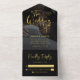 Ce noir moderne et élégant tout en une invitation de mariage dispose de votre propre photo personnelle couvrant complètement l'arrière - plan supérieur. Une simple superposition noire contient de la typographie de script à la mode en or, et le reste de l'arrière - plan est noir. Un look glamour et élégant que vos invités adoreront !
