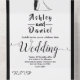 Cette élégante faire-part de mariage en arc noir et blanc est parfaite pour un mariage moderne. Le design simple présente une élégante calligraphie noire et une illustration de mariée et de mariée sur un arrière - plan blanc propre.