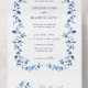 Elégante aquarelle fleurs et vigne Bleu et blanc Delft le tout dans une faire-part de mariage avec paraphes de couple.