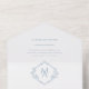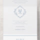 Ce faire-part de mariage en ivoire est doté d'un monogramme moderne en forme de diamant au centre, dont les initiales de la mariée et du marié sont bien visibles. Le monogramme est entouré de typographie classique dans un bleu poussiéreux, ajoutant une touche d'élégance au design. Des détails floraux délicats viennent embellir l'invitation, lui conférant une atmosphère romantique et intemporelle. L'ensemble est sophistiqué et unique, ce qui en fait un choix parfait pour une mariage élégante et sophistiquée.