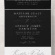 Faire-part de mariage tout-en-un élégant avec vos initiales monogrammes et détails mariages en texte blanc immaculé avec accents de script de calligraphie moderne contre un arrière - plan noir frappant (ou une couleur de votre choix). Ce design élégant comprend une carte RSVP détachable ci-dessous qui peut être envoyée par la poste en tant que carte postale pratique, combinant sophistication et facilité pour votre journée spéciale.