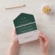 Un modèle tout-en-un unique avec carte rsvp pour une option pratique et économique pour les couples économes en budget. L'invitation moderne mais élégante comprend votre monogramme de deux lettres en haut ainsi que vos détails mariages en blanc sur un arrière - plan vert forêt. Un design chic et design qui conviendra à un couple minimaliste.