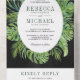Éblouissez vos invités avec cette élégante invitation de mariage à thème tropical avec typographie moderne et feuilles d'aquarelle rustique avec carte postale RSVP détachable. Ajoutez simplement les détails de votre événement sur ce modèle facile à utiliser et ornez cette carte avec votre photo préférée pour en faire une invitation unique.
