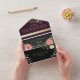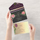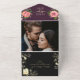 Élégant, boho moderne, gothique, moody romantique, violet et noir tout-en-un faire-part de mariage avec la dentelle florale en faux or, fleurs rose aquarelle et image personnalisée du couple à l'arrière. Ajoutez votre photo, les détails du mariage et rsvp.