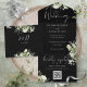 Le tout dans un faire-part de mariage avec des feuilles botaniques de verdure rustique, et la typographie élégante sur un arrière - plan noir. L'invitation comprend une carte RSVP perforée avec un code QR. Conçu par Thisisnotme©