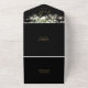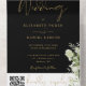 Le tout dans un faire-part de mariage noir et or avec verdure botanique, lumières à cordes et typographie élégante. L'invitation comprend une carte RSVP perforée avec votre code QR du site Web mariage et des détails. Conçu par Thisisnotme©