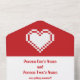 Apportez une touche de plaisir geek à votre événement avec cette carte tout-en-un et faire-part de mariage RSVP. À l'intérieur, vous trouverez un coeur pixélisé blanc sur un arrière - plan cerisier brillant au-dessus d'une section avec un exemple de texte qui peut être customisé pour votre journée spéciale. La partie inférieure de l'invitation est constituée d'une pièce amovible de taille carte postale qui contient un échantillon de texte RSVP placé au-dessus d'une bordure rouge cerise avec un motif de coeurs 8 bits éparpillé dans le fond. À l'extérieur, une bordure similaire de coeurs à thème de jeu vidéo sur cerise se trouve sous les zones où vous ajouteriez des timbres, des normes et des adresses de retour pour l'invitation dans son ensemble et la section RSVP retournable. Le rabat utilisé pour plier et sceller la carte a un seul coeur 8 bits sur un arrière - plan rouge vif avec un échantillon d'initiales que vous pouvez customiser pour une touche personnelle finale qui montre votre amour pour le jeu et l'autre. N'oubliez pas de consulter le reste de l'ensemble Our 8-Bit Hearts in Cherry pour d'autres produits de coordination, y compris les étiquettes d'adresse de retour.