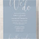 Cette faire-part de mariage minimaliste tout-en-un présente une typographie élégante sur un arrière - plan bleu poussiéreux. L'invitation comprend une carte RSVP perforée avec votre code QR du site Web mariage. Conçu par Thisisnotme©