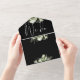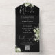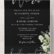 Faire-part de mariage tout-en-un à la végétation fleurie et à la typographie élégante sur un arrière - plan noir. L'invitation comprend une carte RSVP perforée avec un code QR. Conçu par Thisisnotme©