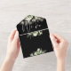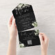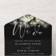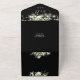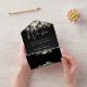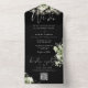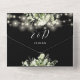 Faire-part de mariage tout-en-un avec de jolies lampes à cordes, une végétation fleurie et une typographie élégante sur un arrière - plan noir. L'invitation comprend une carte RSVP perforée avec un code QR. Conçu par Thisisnotme©