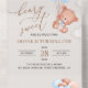 Invitations amis et famille dans le style et donner le ton pour votre journée spéciale avec cette charmante invitation d'anniversaire. Le design présente un ours en peluche avec des ballons bleus sur un arrière - plan beige.