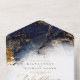 Un arrière - plan abstrait qui évoque le marbre dans les tons bleu marine veiné d'or brillant est la toile de fond de textes élégants et de mises en page design moderne dans les pièces de cette belle suite mariage. Le RSVP et le faire-part de mariage combinés pratiques présentés ici présentent la conception ci-dessus ainsi qu'un modèle pour ajouter facilement vos détails mariages pertinents. Recherchez ID644 pour voir toutes les pièces de coordination de cet ensemble.