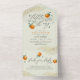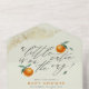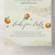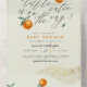 Pastel Green Une Petite Cutie Orange Baby shower All-in-one Invitation. Une petite mignonne est en route ! Célébrez la future maman avec ce design qui met en avant cette phrase en lettres de script élégantes, avec des oranges peintes à la main et des feuilles verts contre un arrière - plan vert pastel. Vos détails de douche apparaissent ci-dessous dans la typographie moderne. Doté d'une section "livres pour bébé" détachable. Il y a une fausse parties scintillant d'or dans les coins supérieur gauche et inférieur droit.