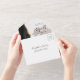 Le bord gauche de cette élégante faire-part de mariage tout-en-un moderne et RSVP est doté d'une bordure en aquarelle noire ornée d'une parties scintillant en faux or. La superposition de texte noir personnalisable combine écriture manuscrite grise au fusain, copperplate et italique sur une photo de votre choix, adoucie avec un filtre blanc pour mettre le texte en surbrillance. L'adresse de retour apparaît sur le rabat extérieur et sur le côté arrière de la carte RSVP détachable.