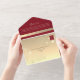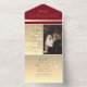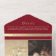 Cette faire-part de mariage tout-en-un moderne présente un dégradé rouge et or frappant avec de l'espace pour une photo personnalisée, la section RSVP et les détails du mariage - aucune insertion requise. Elégant script recouvre des accents d'or botanique pour une touche romantique mais contemporaine. Un choix élégant et respectueux de l'environnement pour les couples à la recherche d'un format tout compris compact. Remarque : Cette invitation tout-en-un nécessite une enveloppe distincte pour l'envoi. Nous vous recommandons de l'apparier avec une enveloppe A9 standard (5,75 po x 8,75 po) pour un meilleur ajustement.
