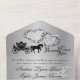 Conte de fée enchanteur faire-part de mariage triple avec une carriole tirée à cheval antique et coeurs avec monogramme dans un gris argenté.