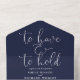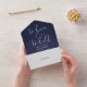 Cette faire-part de mariage minimaliste tout-en-un présente une typographie élégante sur un arrière - plan bleu marine. L'invitation comprend une carte RSVP perforée qui peut être adressée individuellement ou laissée vide afin que vous puissiez écrire à la main les coordonnées de votre invité. Conçu par Thisisnotme©