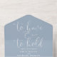 Cette faire-part de mariage minimaliste tout-en-un présente une typographie élégante sur un arrière - plan bleu poussiéreux. L'invitation comprend une carte RSVP perforée qui peut être adressée individuellement ou laissée vide afin que vous puissiez écrire à la main les coordonnées de votre invité. Conçu par Thisisnotme©