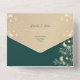 Célébrez votre grande journée dans un style intemporel avec cette faire-part de mariage tout-en-un vert émeraude et or aux accents floraux délicats, un code QR moderne pour une RSVP facile, et une élégante typographie or. Ce design respectueux de l'environnement est parfait pour les mariages d'hiver ou de vacances, alliant confort et sophistication. La carte postale RSVP intégrée et le panneau d'adresse rendent l'envoi simple et économique. Personnalisez avec vos détails de mariage pour une conservation unique.