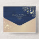 Elegant rustic navy blue wood and rose gold all-in-one wedding invitation featuring floral accents, soft string lights, and a personalized monogram. This invitation doubles as an envelope and includes a QR code for RSVP and a link to your wedding website — perfect for couples who love a balance of rustic charm and modern convenience. The deep navy wood texture with shimmering rose gold florals makes it ideal for fall, barn, or evening weddings.