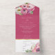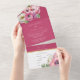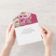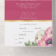Cette faire-part de mariage fleurie romantique présente un design tout-en-un avec une carte R.S.V.P. incluse en bas. L'arrière - plan est une élégante couleur rose pâle avec une aquarelle blanche et des fleurs de ranunculus roses. Une ligne de style feuille d'or borde la portion R.S.V.P. Un délicat bouquet de ranunculus et de verdure est représenté sur le rabat avant, et deux sur la partie intérieure.