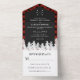 Rustique tout en un faire-part de mariage avec un arrière - plan de contrôle de buffle rouge et votre monogramme flanc flanqué flanqué flèches croisées. Ci-dessous, un croquis de pins couverts de neige.