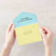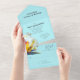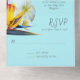 Invitation fleurs tropicales tout-en-un à utiliser pour une cérémonie de renouvellement de vœux, ou mariage, ou autre événement. Couleurs bleu aqua et jaune avec image de bouquet de fleurs hawaïennes à l'intérieur. De grandes fleurs de plumeria blanches et d'hibiscus roses et des oiseaux-de-paradis jaunes créent un joli design à l'intérieur de la carte. L'invitation d'une seule pièce et la carte de réponse s'ouvrent avec le texte à l'intérieur du rabat, au centre, et en bas où la carte RSVP se détache. Les invités peuvent facilement déposer la réponse dans la boîte aux lettres comme une carte postale - elle nécessite également un affranchissement de carte postale ! L'extérieur de cette carte est jaune et toutes les polices manuscrites sont gris foncé. Des espaces sont prévus pour inclure les adresses - adresse de retour, adresse post