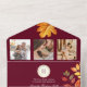 Célébrez votre amour avec cette invitation tout-en-un de mariage de automne rustique bordeaux. Doté de feuilles d'automne aquarelle, d'une section photo et d'un code QR pratique pour RSVP. Parfait pour les mariages saisonniers, ce design écologique offre un format pliable et expéditif.