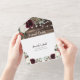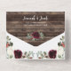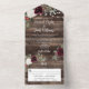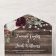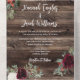 Ce mariage rustique d'hiver de Noël tout en une invitation avec RSVP est parfait pour un mariage de vacances élégant. Le design présente de belles fleurs d'aquarelle blanche et bordeaux avec une végétation de pins, de baies saintes et d'eucalyptus sur un arrière - plan de bois. Il s'agit d'une palette de couleurs parfaite pour un mariage d'hiver. Faites cette invitation vous-même en incluant vos noms et tous vos détails mariages. Pour plus de personnalisation, utilisez l'outil de conception avancée pour modifier ce modèle.