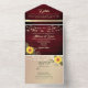 Célébrez le charme intemporel de l'amour avec ce faire-part de mariage tout-en-un enchanteur, alliant chaleur rustique et élégance moderne. Conçu sur du papier bordeaux d'inspiration barne, il présente une dentelle dorée chatoyante et la douce lueur des lampes à cordes, créant une atmosphère cosy et sophistiquée. Des tournesols radiants apportent une touche symbolique joyeuse, tandis qu'une photo personnalisée du couple sur le dos le rend profondément personnel et mémorable. Les détails de votre mariage et l'information RSVP sont magnifiquement intégrés dans une mise en page simple et pratique, idéale pour les mariages d'automne ou de style rustique. Remarque : Cette invitation tout-en-un nécessite une enveloppe distincte pour l'envoi. Nous vous recommandons de l'apparier avec une enveloppe A9 standard (5,75 po x 8,75 po) pour un meilleur ajustement.