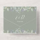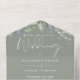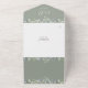 Faire-part de mariage tout-en-un avec verdure fleurie et typographie élégante sur un arrière - plan vert sage. L'invitation comprend une carte RSVP perforée qui contient le code QR de votre site Web mariage. Conçu par Thisisnotme©